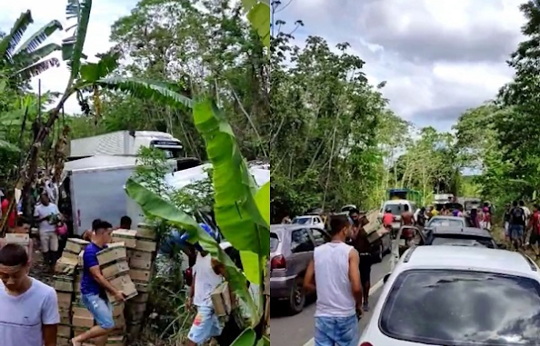Na manhã deste domingo, 24 de dezembro, um acidente foi registrado na BR-101, nas imediações da Curva do Sebo, no município de Gandu. Vídeos compartilhados nas redes sociais mostram populares saqueando a carga que, segundo moradores da região, seria de biscoitos e macarrão.