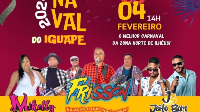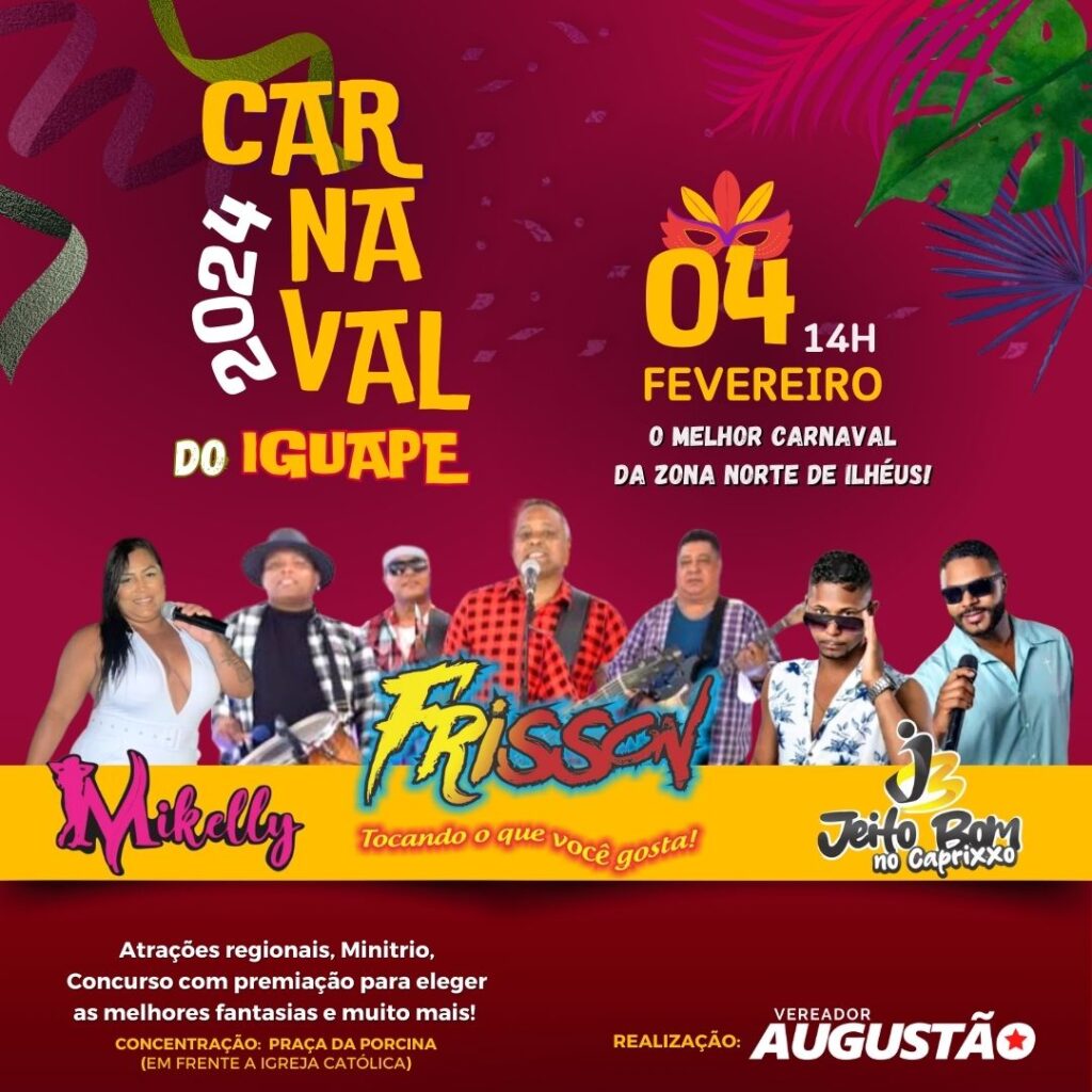 A alegria vai tomar conta das ruas do bairro do Iguape neste domingo, com a realização do tradicional Carnaval da Zona Norte. A festa vai contar com a apresentação das bandas Frisson, Mikelly e Jeito Bom no Caprixxo, além de grupos afros e o concurso para a escolha da melhor fantasia. A realização é do vereador Augustão, em parceria com a comunidade.