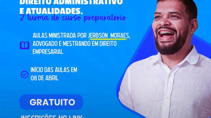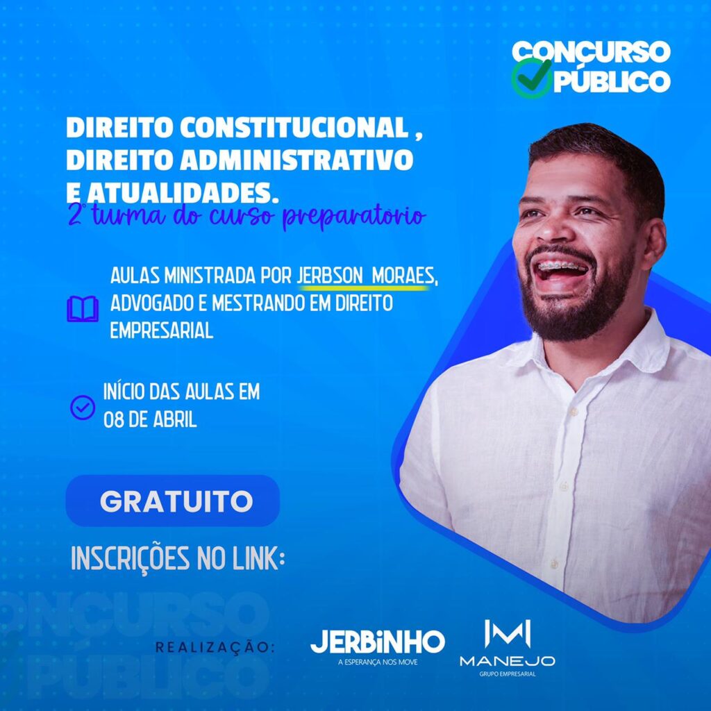 A oportunidade que você estava esperando chegou! Estão abertas as inscrições para a 2ª turma do nosso curso preparatório GRATUITO para concurso público, focado em Direito Constitucional, Direito Administrativo e Atualidades. As aulas serão ministradas pelo Vereador e advogado, mestrando em Direito Empresarial, Jerbson Moraes.