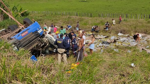 Ainda do acordo com a informação, o veículo caiu em um desnível, no trecho conhecido como Curva da Visqueira. O trânsito seguia normalmente. Logo após o acidente, um grupo de pessoas começou a saquear parte dos produtos. A ação criminosa foi coibida com chegada de agentes da PRF. No entanto, a empresa deu autorização ao grupo para levar os produtos com embalagens danificadas.