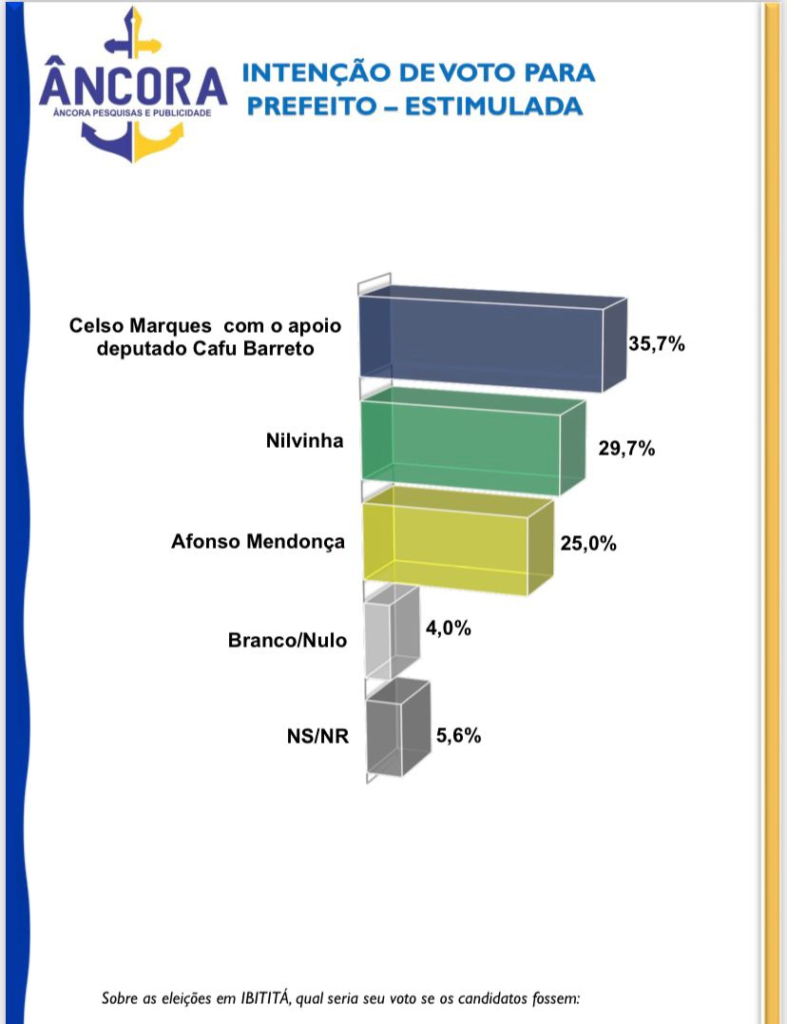 De acordo com pesquisa registrada na Justiça, Celson Marques (PSD) lidera a Corrida Eleitoral em Ibititá, com 35,7% das intenções de votos, levando em conta o levantamento estimulado, quando seu nome é apresentado com o apoio do deputado estadual Cafu Barreto. Na segunda posição aparece a atual prefeita Nilvinha dos Santos, com 29,7%; seguida de Afonso Mendonça, 25%. Confirmando um cenário bem definido, brancos, nulos e indecisos somam 9,6%. A pesquisa, realizada pela Âncora Pesquisa e Publicidade nos dias 20 e 21 deste mês, ouviu 385 pessoas na sede e na zona rural do município, possui margem de erro de 5% e intervalo de confiança 95%.