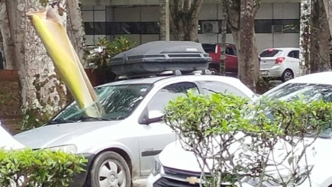 Um galho de uma árvore palmeira imperial desabou sobre um carro e atravessou o para-brisa do veículo, no estacionamento da Universidade Estadual de Santa Cruz (Uesc), em Ilhéus, nesta terça-feira (4).