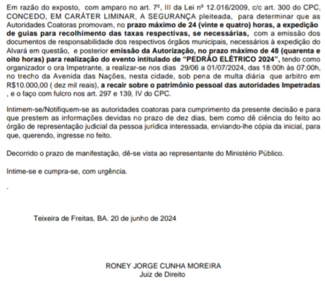 Em uma reviravolta judicial, a Prefeitura de Teixeira de Freitas tentou mais uma vez impedir a realização do tradicional evento Pedrão Elétrico, programado para 29 de junho a 01 de julho deste ano. No entanto, o juiz Roney Jorge decidiu favoravelmente à realização do evento.
