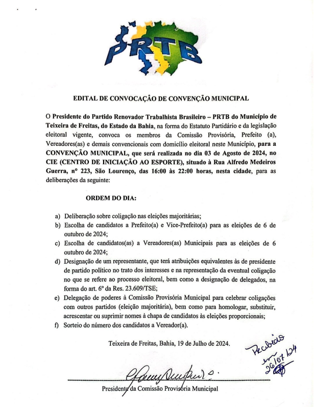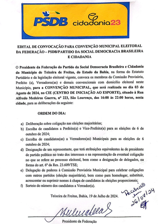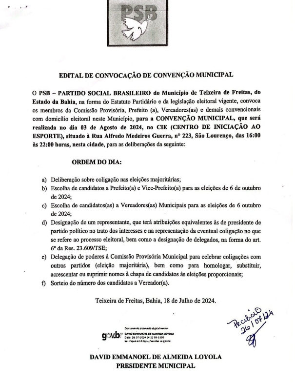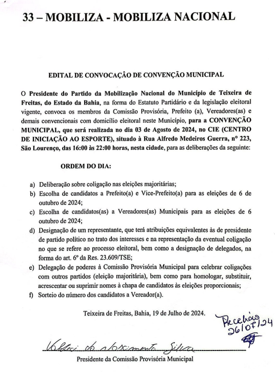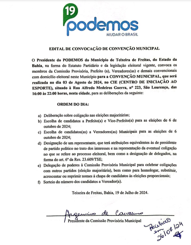 O Movimento Democrático Brasileiro (MDB) anunciou a publicação de um edital de convocação para a convenção municipal, que contará com a presença dos partidos aliados de base: Podemos, PRTB, PSDB e PSB. O evento está programado para o dia 03 de agosto, no CIE (CENTRO DE INICIAÇÃO AO ESPORTE), situado na Rua Alfredo Medeiros Guerra nº233, São Lourenço, ocorrerá das 16h às 22h.