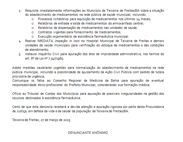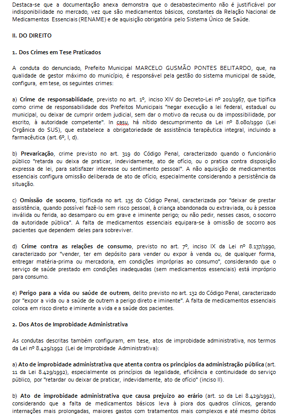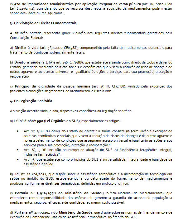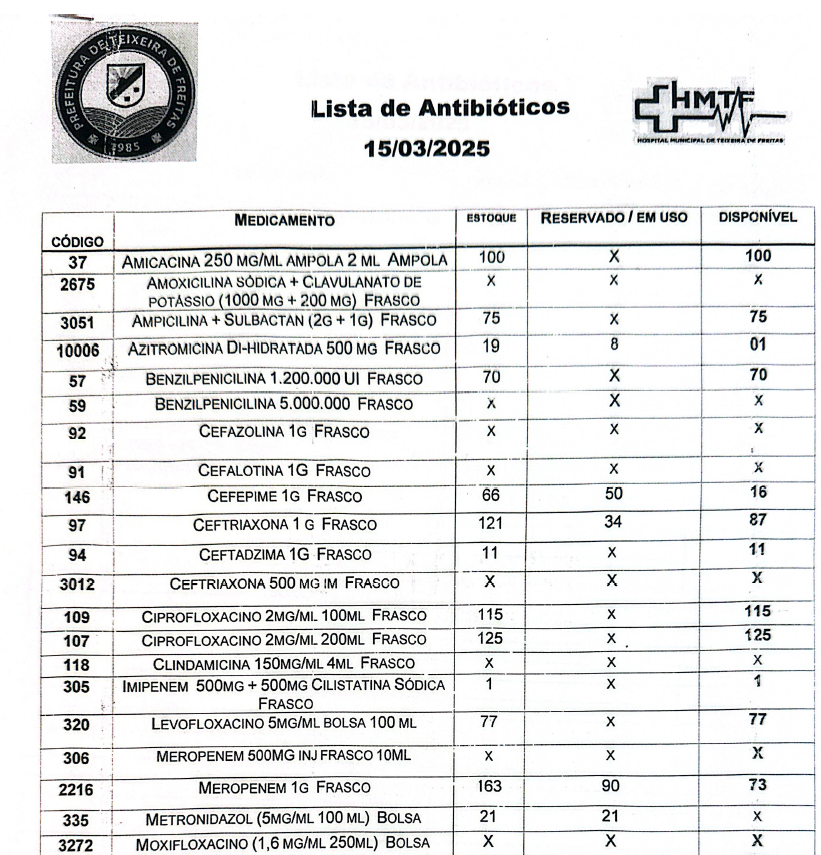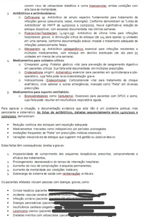 A denúncia, acompanhada de documentos comprobatórios, aponta a AUSÊNCIA DE MEDICAMENTOS VITAIS, como antibóticos, insulina, broncodilatadores e anti-hipertensivos, comprometendo tratamentos e resultando em complicações evitáveis. Entre os medicamentos indisponíveis estão: