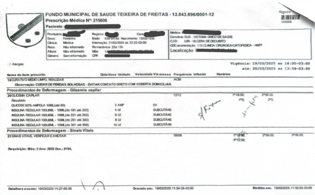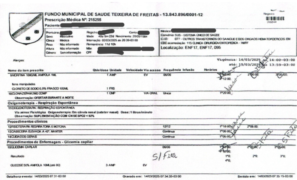 A crise na saúde de Teixeira de Freitas alcançou um novo patamar de desumanidade. Uma grave denúncia anônima revela a FALTA SISTEMÁTICA DE MEDICAMENTOS essenciais no Hospital Municipal de Teixeira de Freitas (HMTF), colocando vidas em risco diariamente. Enquanto isso, vários dos 19 vereadores da cidade seguem inertes, sem fiscalizar com o rigor necessário a gestão do prefeito Marcelo Gusmão Pontes Belitardo. Até quando a população suportará esse descaso?