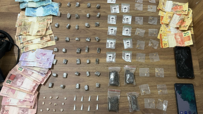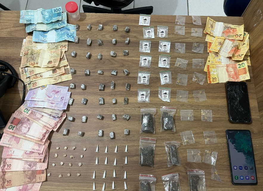 Policiais patrulhavam o Bairro Quinto Centenário e ao abordarem pessoas em atitude suspeita localizaram 40 “buchas” e 07 “pacotes” de maconha; 35 “pedras” de crack; 20 “pinos” e 11 “papelotes” de cocaína, além de uma quantidade de dinheiro em espécie e outros materiais ligados ao tráfico de entorpecentes.