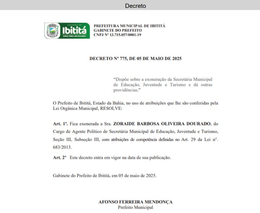 Foi publicado no Diário Oficial do Município de Ibititá da última segunda-feira, 05.05.2025 o Decreto Municipal nº 775, que dispondo sobre a exoneração da Secretária Municipal de Educação, Juventude e Turismo de Ibititá, a Sra. Zoraide Barbosa Oliveira Dourado.