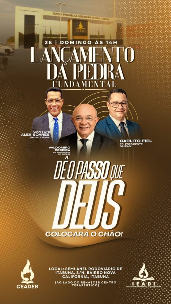 A Assembleia de Deus em Itabuna se prepara para um dos momentos mais marcantes de sua história. No dia 28 de setembro de 2025, será realizada a cerimônia de lançamento da pedra fundamental do Grande Centro de Eventos da Assembleia de Deus Itabuna , um marco profético de fé, gratidão e celebração ao Senhor.