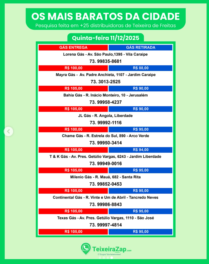 O Radar do Gás traz, nesta atualização especial, um panorama completo dos preços do botijão em Teixeira de Freitas. A equipe percorreu mais de 20 distribuidoras da cidade e encontrou diferenças que podem garantir até 12% de economia para o consumidor — um alívio importante em tempos de orçamento apertado.