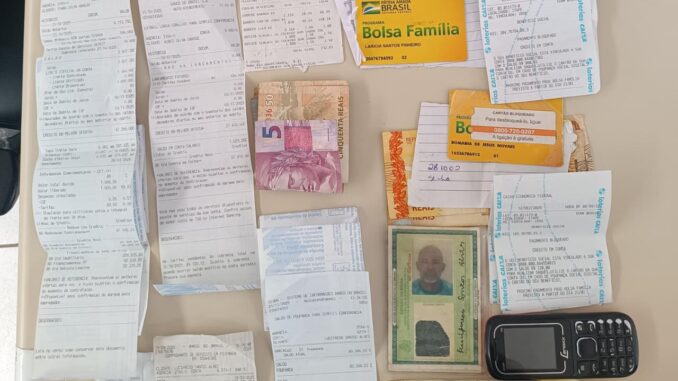 O homem foi identificado pelas iniciais L. S. A.. Com ele, foram localizados os cartões do Bolsa Família pertencentes a L. S. P. e R. J. N., além de comprovantes de saque, senhas anotadas e os valores sacados: R$ 960,00 referentes a um dos benefícios e R$ 120,00 referentes ao outro.