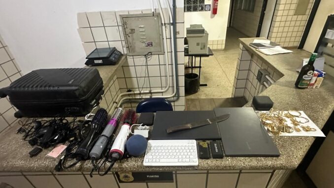 O material apreendido e recuperado foi o seguinte: 01 bicicleta, 01 notebook Dell, 01 notebook Samsung, 01 Alexa, 01 HD externo, 03 escovas modeladoras de cabelo, 01 teclado para PC, 02 cigarros eletrônicos, 01 faca, diversas bijuterias e 01 mala de viagem.