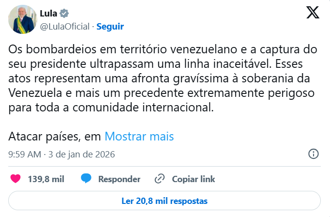 O presidente Lula comentou e repudiou os ataques à Venezuela. Sem citar os Estados Unidos, ele disse que os bombardeios e a prisão de Maduro e sua esposa “ultrapassam uma linha inaceitável”.
