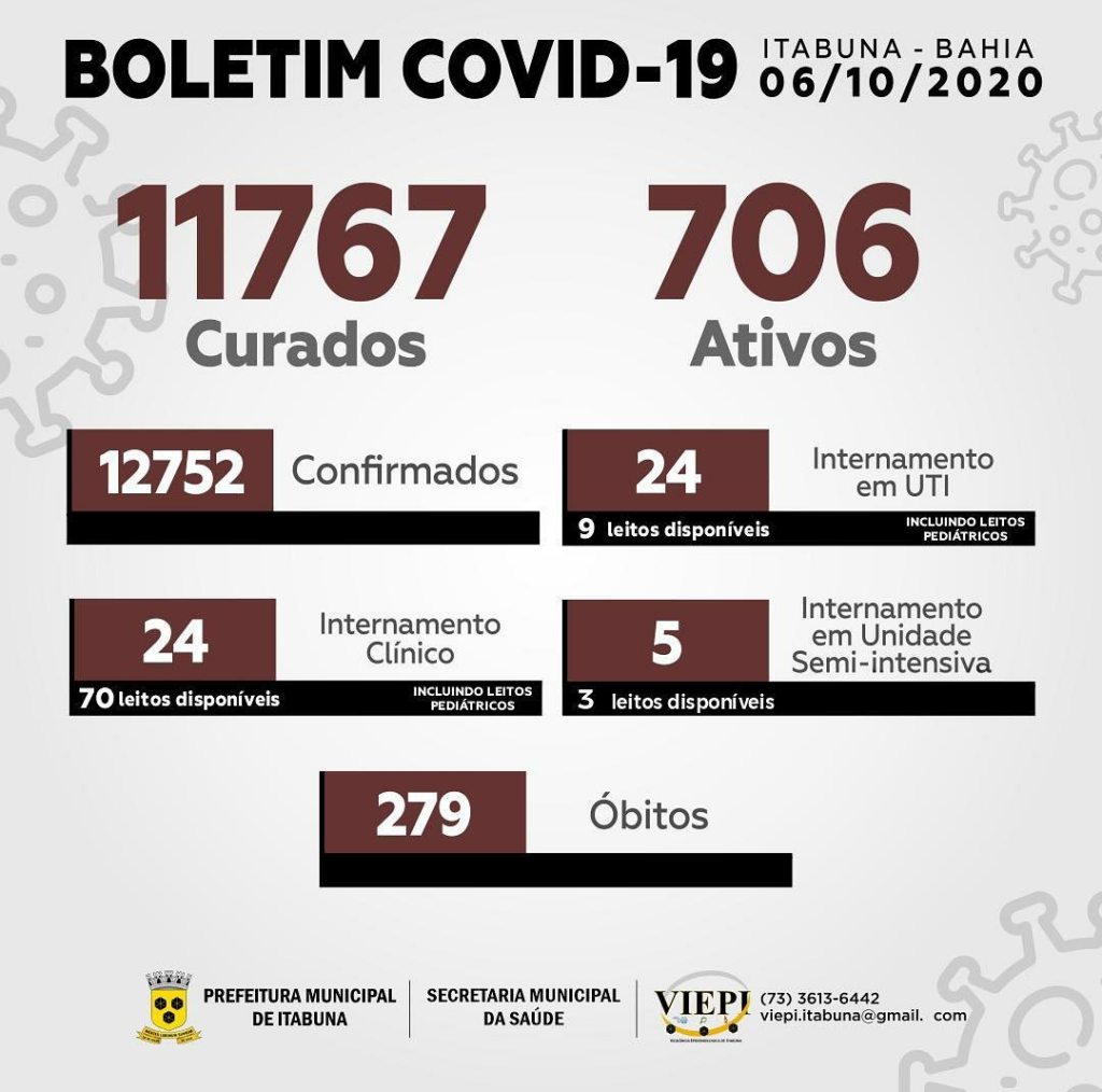 O boletim indica que 24 pacientes estão internados em leito clínico, restando 70 leitos disponíveis incluindo os pediátricos. 24 pacientes estão em Unidade de Terapia Intensiva, restando 9 leitos disponíveis. Em contrapartida, 11.767 pessoas já estão curadas da doença.