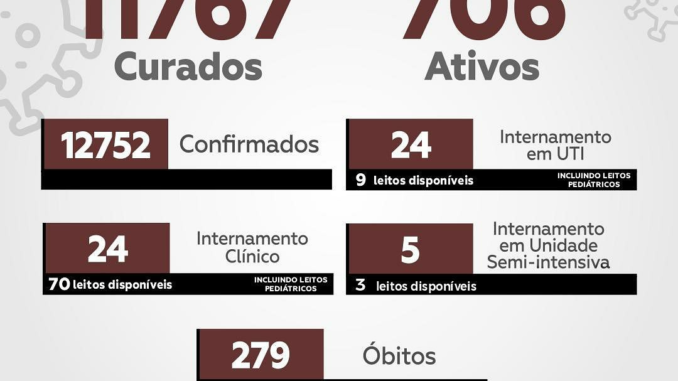 O município contabiliza 279 óbitos em decorrência da doença. Foram registrados um decréscimo de 101 casos nas últimas 24h, o número de ativos é de 832.