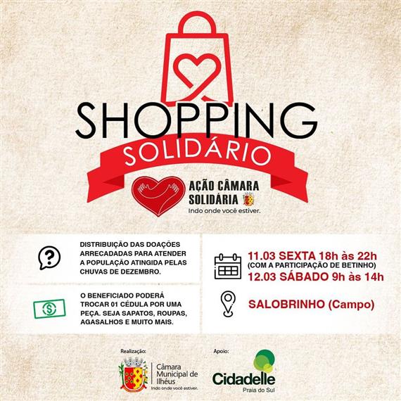 A ação terá início na sexta-feira (11), a partir das 18h, com a participação musical de Betinho, e continuará no sábado (12), das 9h às 14h, no Campo do Salobrinho. Serão distribuídas “cédulas” para os moradores da comunidade citada, que deverão comparecer ao local e trocar as “fichas” por peças que necessitam. O Shopping Solidário é mais uma ação realizada pela Câmara de Ilhéus para atender estas famílias, principalmente das áreas ribeirinhas, que foram as mais atingidas com as chuvas.