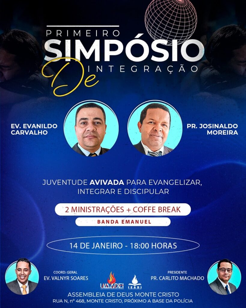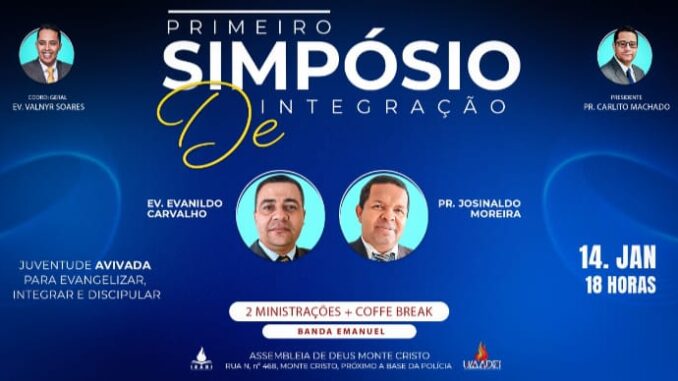 Vem aí o Primeiro Simpósio de Integração, organizado pela Assembleia de Deus em Itabuna (IEADI). O evento será realizado dia 14 de janeiro e iniciará às 18:00. Sendo sediado na congregação da Assembleia de Deus- Rua número 468, Monte Cristo, (Próximo a Base Policial).