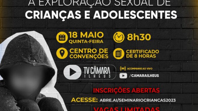 A Câmara de Vereadores de Ilhéus, através da Comissão de Direitos Humanos, abriu nesta semana as inscrições para o Seminário Municipal de Enfrentamento e Combate à Exploração Sexual de Crianças e Adolescentes que acontecerá no dia 18, a partir das 8h30, no Centro de Convenções. As vagas para o seminário são limitadas e os participantes terão direito a certificado com carga horária de 8 horas.