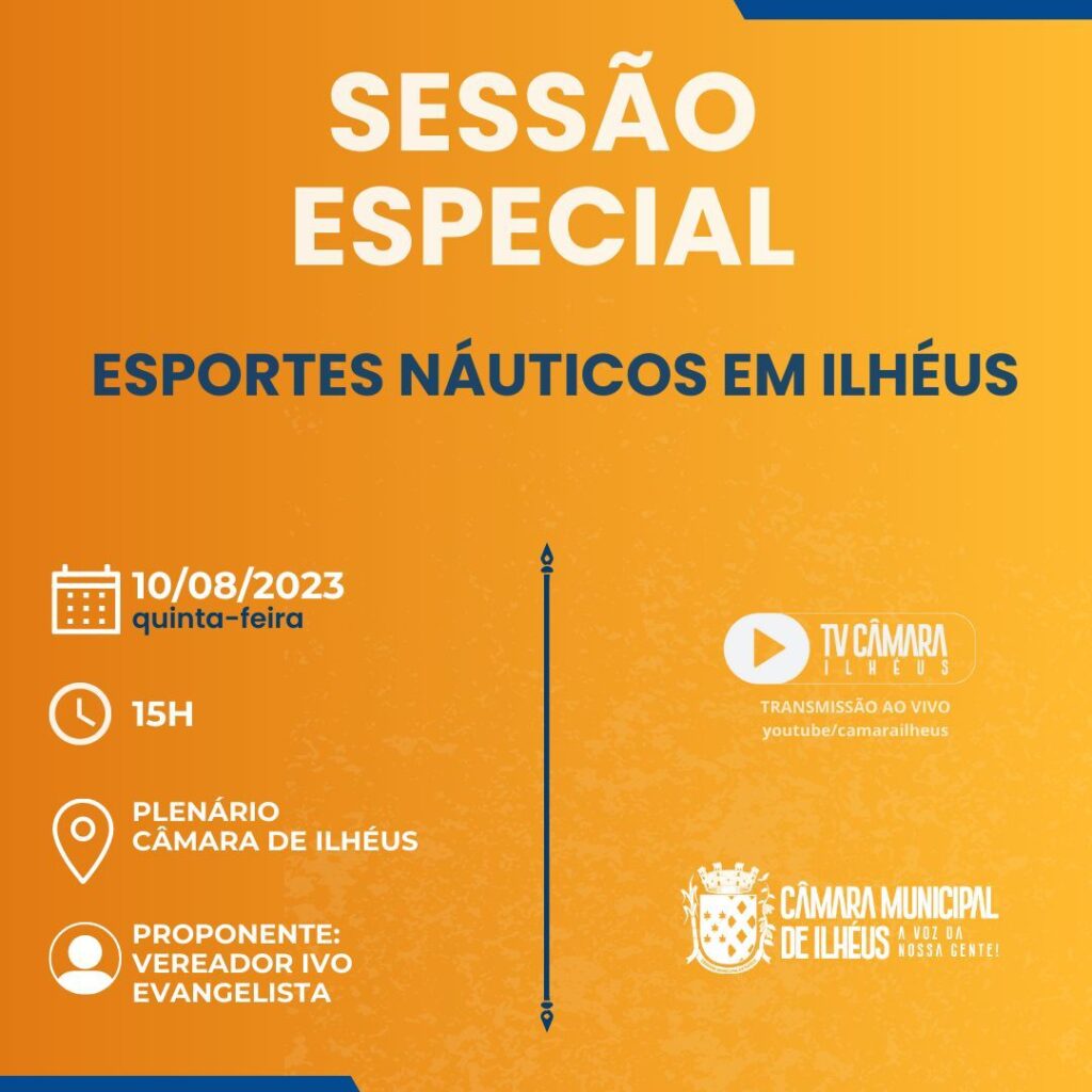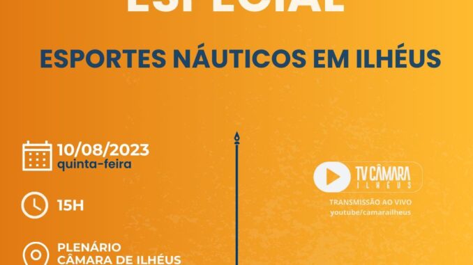 O vereador e vice-presidente da Câmara Municipal de Ilhéus, Ivo Evangelista (REPUBLICANOS), solicitou através de requerimento aprovado por unanimidade na Casa Legislativa, que o plenário Gilberto Fialho possa sediar uma Sessão Especial para discutir a prática de esportes náuticos no município, na próxima quinta-feira (10), a partir das 15h. Segundo Ivo, Ilhéus possui um extenso litoral “sendo um cenário propício para a prática de diversas modalidades de esportes aquáticos”.